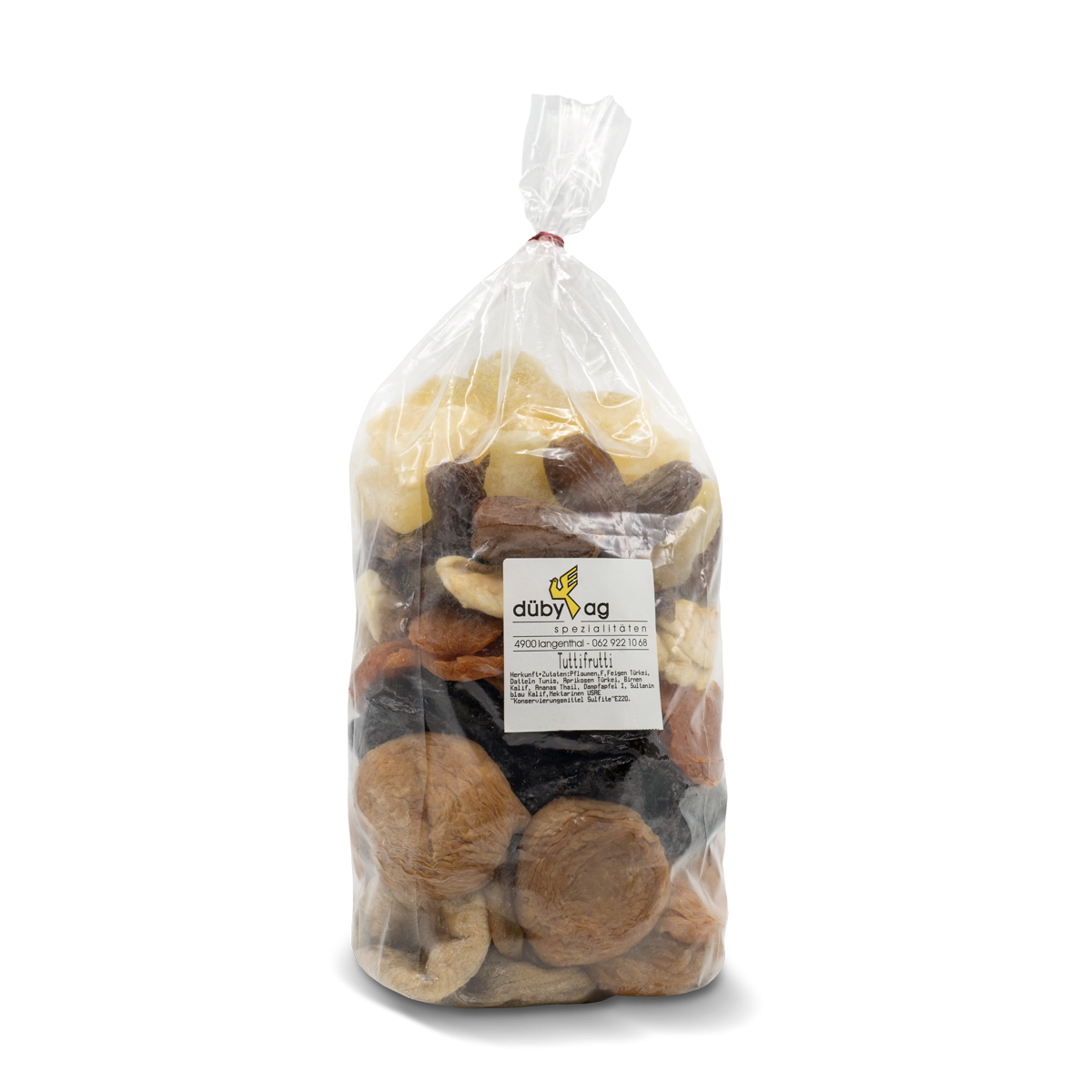 Inhalt/ Herkunft: Pflaumen (Frankreich), Feigen (Türkei), Datteln (Tunesien), Aprikosen (Türkei), Birnen (Kalifornien), Ananas (Thailand), Dampfapfel (Italien), Sultanien blau (Kalifornien), Nektarinen (USA), Konservierungsmittel Sulfite E 220